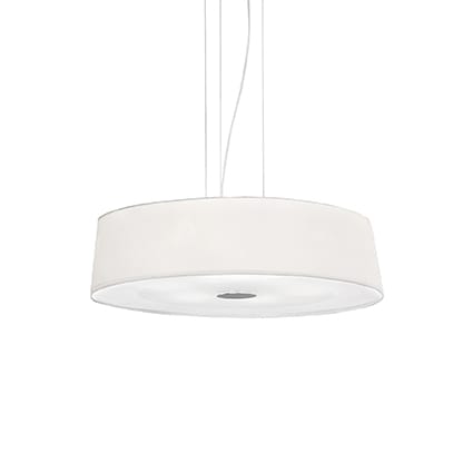 Chrome metal frame. PVC foil shade covered in fabric. Transparent, sandblasted bottom glass diffuser. Pendant lamps provided with cables adjustable in length.