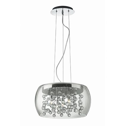 Original pendant lamp made of chromed metal base and transparent glass diffuser with decorative glass balls, equipped with steel wires, which can be adjusted in height using an automatic device. Stylish luminaire suitable for any home, hotel or restaurant.